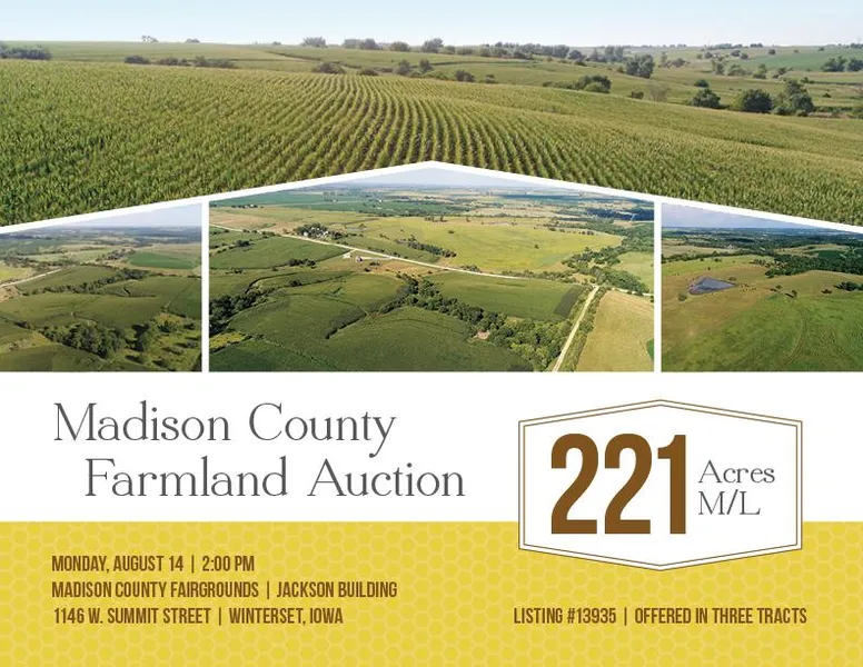 221 Acres M/L of diverse Madison County farmland to be auctioned Monday, August 14th! Farm will be sold in three tracts. Tract 1 consists of 40 Acres M/L of which 29.42 Acres are FSA tillable and carry a CSR2 of 41.9. Tract 2 consists of 181 Acres M/L including 119.67 FSA Cropland acres of which 97.8 Acres are enrolled into CRP programs paying $19,400 annually through 2023. Additionally, there are 6.57 acres currently in row crop production. The remainder of the farm is currently in pasture/hay. Tract 3 will be a combination of Tracts 1 & 2. Farms are located west of Winterset, just off Highway 92, and in Sections 2 & 3 of Webster Township, Madison County, Iowa.