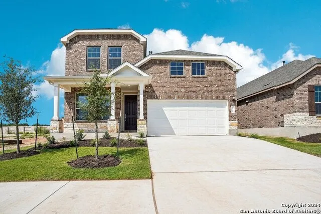 Nestled in the picturesque hill country of La Cima, this stunning two-story home combines timeless charm with modern elegance. The full-brick exterior and inviting front porch create a warm welcome, perfectly blending into the natural surroundings. Step inside the foyer, where you'll be greeted by wood-like tile flooring that spans the entire first floor, including the luxurious owner's suite. Designed for comfort and style, the suite boasts elegant tray ceilings, a serene bay window with scenic views, and a spa-like retreat. At the heart of the home, the gourmet kitchen is a chef's dream. Custom touches abound, from the striking canopy vent hood and intricate tile backsplash extending to the ceiling, to the gleaming white quartz countertops that perfectly complement the modern design. This space is as functional as it is beautiful, making it ideal for entertaining or enjoying quiet family meals. This home is a true gem, offering the perfect balance of style, comfort, and location in the desirable La Cima community. Experience the best of Hill Country living-schedule your tour today!