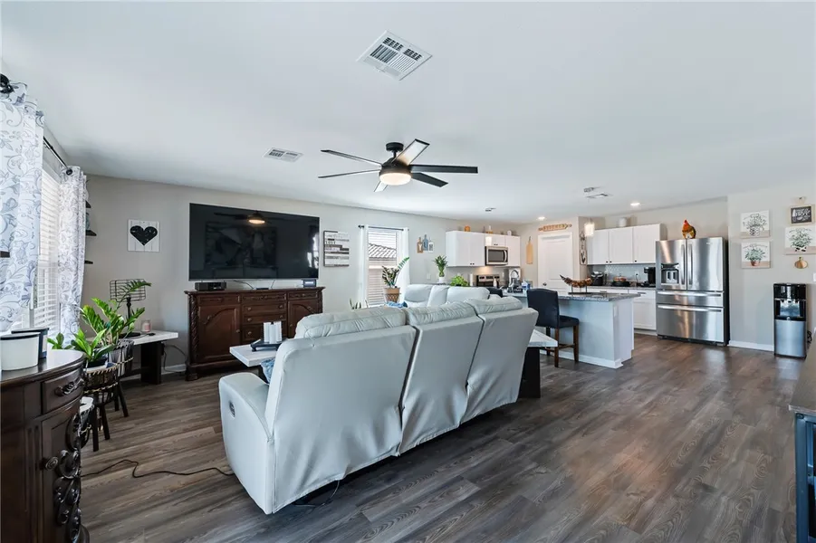 Discover this immaculate 4-bedroom, 2-bath home, less than a year old and loaded with thoughtful upgrades. Stylish plank flooring flows through the open-concept living space into a beautifully upgraded kitchen featuring modern cabinet hardware, a hidden trash, custom backsplash, waterproof pantry liners, enhanced lighting, and a water softener. Six ceiling fans have been added throughout for year-round comfort. The insulated, drywalled garage offers extra convenience, while the side yard provides RV parking and the oversized backyard gives you space to create your dream outdoor retreat. Located in a quiet neighborhood, this move-in-ready home blends modern style with practical features. Schedule your showing today!