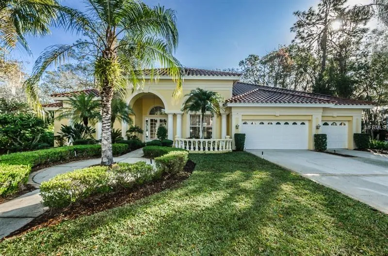 EAST LAKE WOODLANDS TURTLE CREEK - Neatly set on a large tree lined, private lot overlooking the East Lake Woodlands North Golf Course. A circular driveway leads to a gracious covered entry w/ French doors & side lights. Formal areas flow seamlessly into casual rooms w/ volume ceilings & clerestory windows. This Arthur Rutenberg built; 3-way split plan is light & bright w/ countless windows that capitalize on extraordinary views; it includes 4 bdrms, 3.5 baths + study in 3,453 SF of gracious living space. It has fresh neutral interior paint w/ newly installed neutral carpet in formal rms & study, wood flrs in bedrms & family room. The kitchen has raised panel cabinets, Corian counters, center island w/ prep sink & disposal, desk & large pantryall overlooking the family room with wood burning fireplace. An updated master suite has an adjacent retreat area. The master bath has been updated with Travertine shower & floors, double sinks, spa tub and modern fixtures, plus a large, organized walk-in closet. Two secondary bedrooms are separated by a shared bath; the guest suite is on the back of the home with a full bath and access to the pool area. A separate laundry room offers a bonus HVA/C controlled 5 X 11 and 8 high storage room in the attic above, perfect for protected seasonal storage, luggage, etc. A very private lanai & deck area over look pool & spa w/ mature landscaping and views to the golf course beyond. Big 3 car garage w/ updated cabinet storage and tile flooring. Roof replaced 2013.