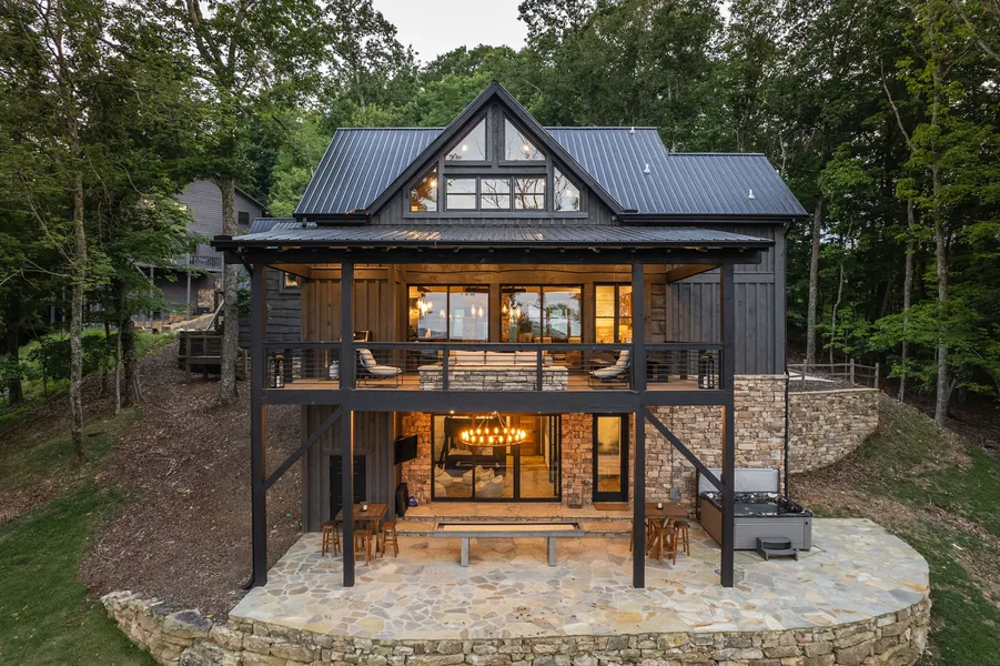 An ethereal mountain retreat -- welcome to Stags Manor! Overlooking panoramic layered mountain views, lush U. S. National Forestry land, and some of the best sunsets in the North Georgia Mountains! This rustic-contemporary blend chalet beckons luxurious mountain living with a gourmet kitchen, Viking kitchen appliances, custom concrete countertops, custom stone masonry work, chef's kitchen eat-in island and large open-concept dining area, comfortable living room, and the focal point of the main level: a four-sided fireplace! Glass sliders open up to the most luxurious covered deck with a custom linear fire table, outdoor grilling area, comfortable seating, and views across the horizon. The main house is complete with an upstairs primary bedroom with in-room laundry, a large coffee/wine bar, office, and ample custom storage. The terrace level has a large bunk room, fireplace, large bathroom, and walk-out sliders to a large patio with a jacuzzi and gaming area. The two car finished garage has an additional full bedroom en suite above with kitchenette. Fully-furnished with high-end furnishings and decor, minutes away from some of the area's most sought-after hiking and biking trails, the Toccoa River, Lake Blue Ridge -- the outdoor world is your oyster! Concrete driveway, designer lighting, and a finishes list that far exceeds the "mountain norm!" Whether a full-time, second home, or rental retreat, this unique and luxurious lodge will not last long. Call today for an exclusive tour.