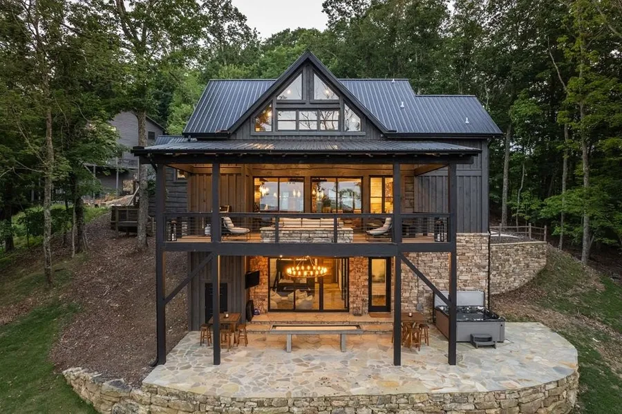 An ethereal mountain retreat -- welcome to Stags Manor! Overlooking panoramic layered mountain views, lush U. S. National Forestry land, and some of the best sunsets in the North Georgia Mountains! This rustic-contemporary blend chalet beckons luxurious mountain living with a gourmet kitchen, VIKING kitchen appliances, custom concrete countertops, custom stone masonry work, chef's kitchen eat-in island and large open-concept dining area, comfortable living room, and the focal point of the main level: a four-sided fireplace! Glass sliders open up to the most luxurious covered deck with a custom linear fire table, outdoor grilling area, comfortable seating, and views across the horizon. Main house is complete with an upstairs primary bedroom with in-room laundry, a large coffee/wine bar, office, and ample custom storage. Terrace level has a large bunk room, fireplace, large bathroom, and walk-out sliders to a large patio with a jacuzzi and gaming area. Two car finished garage has an additional full bedroom ensuite above with kitchenette. Fully-furnished with high-end furnishings and decor, minutes away from some of the area's most sought-after hiking and biking trails, the Toccoa River, Lake Blue Ridge -- the outdoor world is your oyster! Concrete driveway, designer lighting, and a finishes list that far exceeds the "mountain norm!" Whether a full-time, second home, or rental retreat, this unique and luxurious lodge won't last long. Call today for an exclusive tour.