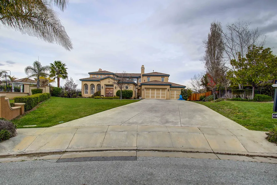 Exclusive Tuscan Hills Estate with Italian-style Villas, good schools, Silvercreek Country Club, Shops, Restaurants and Hwy access to Apple, Netflix. A secluded cul-de-sac is dominated by this stunning villa which sits on 1.38 acres with spectacular views overlooking Silicon Valley and Evergreen hills. Grand entrance hall leads to a Library, Living, Dining rooms with 18 foot high ceilings, hardwood floors to the Family room and Gourmet Kitchen with Granite counters, cherry cabinets and top brand appliances. Travertine tiles lead past the kitchen to two Bedrooms, shared bathroom, Utility room and 3 car garage. From the dining room a staircase leads to 2 bedrooms, an enormous Master Bedroom, master bathroom tiled in Italian vanilla marble with huge double shower, double vanity, jacuzzi. In the center of the house through French doors is a Courtyard with fireplace and slate floor, ideal for entertainment and dining. Extra wide driveway with paths to a huge backyard with fruit trees.