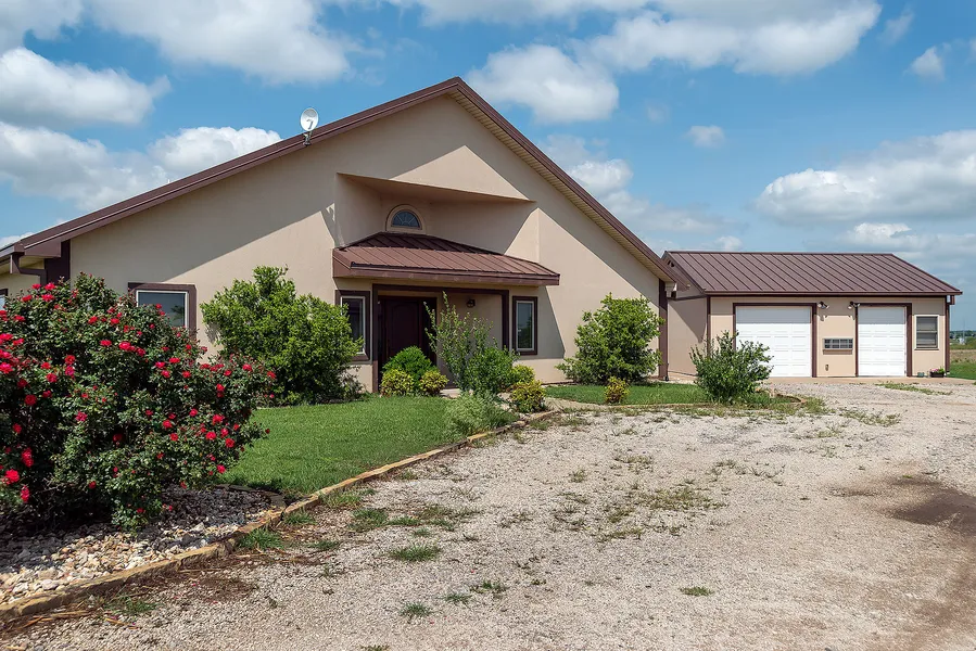 Looking for a Ranch Headquarters with easy access to the Cimarron turnpike? This beautiful property features an automatic gated entrance that leads you onto 15 acres that has been cross fenced. The property features a luxurious 4 bedroom, 3 bathroom home, and livestock facilities. The great room has vaulted ceilings with rustic wood accent beams and hard wood floors. Throughout the remainder of the home you will enjoy polished and stained concrete floors. The kitchen features top of the line stainless steel appliances including a double convection oven, a Jenn-Aire cooktop with downdraft technology, quartz countertops and a tumbled tile backsplash. The Custom cabinets are knotty alder with custom iron hardware. The cabinets have pullout drawers and quiet close doors. To the left of the kitchen is large formal dining room or flex room featuring a built-in display hutch. The large pantry has a hidden surprise. Underfoot is a door that takes you to the storm shelter. The master bath features a 5 piece luxury accommodations with a large walk in shower, a jetted tub, and a double vanity. Attached to the large master bedroom is a home office. As every ranch house should this home has a deluxe mudroom/ laundry room with a sink. To the east of the home is a 2 car garage that is complete with a 1 of the 3 Full bathrooms, a kitchenette, plus heat and air. Outdoor facilities include a 100 x 30 x 18 red steel building, 50 x 26 pole barn, 30 x 60 red steel barn with cement wash racks, multiple overhead doors to control air circulation, it features spray foam insulation on the walls and roof. A multiple pen and paddocks system fans out from this building to aid in livestock handling. There are also multiple automatic cement waters for your livestock needs.