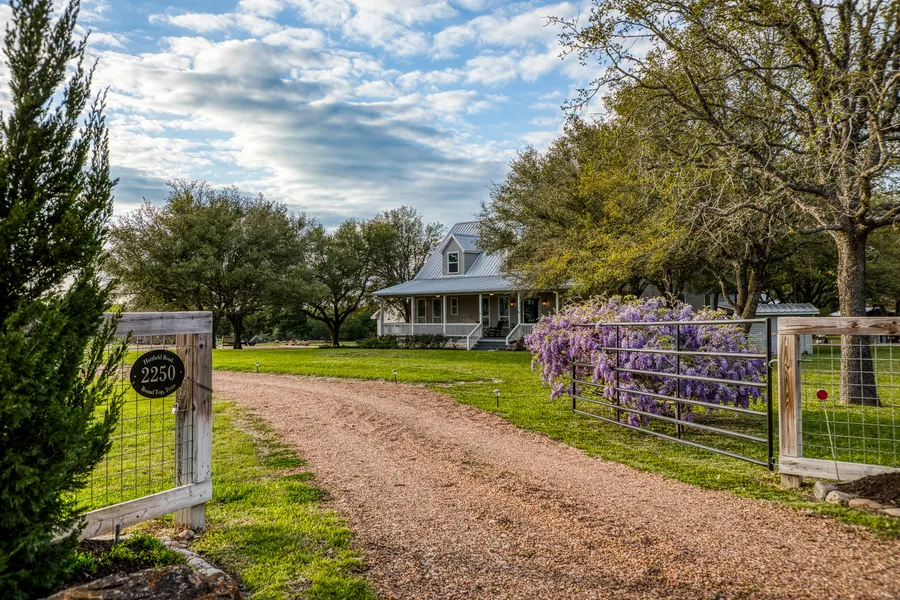 Nestled on lush +/-4 acres along one of Round Top's most coveted roads. This modern farmhouse exudes charm and comfort, boasting sprawling century oaks and impeccable curb appeal. Inside, discover open living spaces flooded with natural light and adorned with stylish finishes. The expansive kitchen features sleek countertops and top of the line stainless steel appliances. Entertain effortlessly in the dining area or around the island. Outside, a spacious screened-in porch, gather around the fire pit or seek tranquility in the charming gazebo under the stars. This property offers luxury and charm in one of Texas' most beloved destinations. The main home offers 2,303 sqft, two bedroom, three and a half baths with a boastful study, the cottages (2) used for short term rental with proven revenue and repeat guests, offers one bedroom, one bathroom with living/kitchen areas in each, with a total of 1,046 sqft. **Most furnishings included