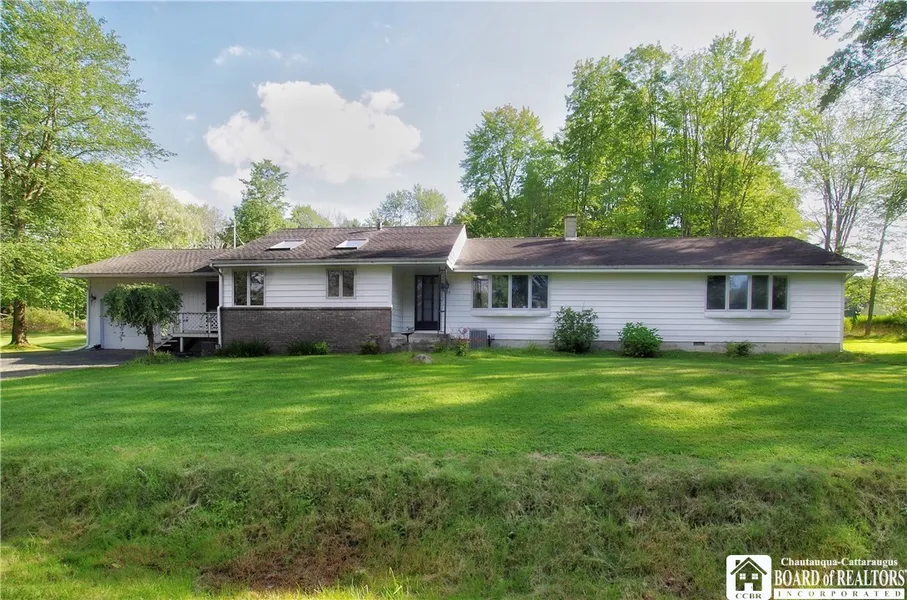 Set on the edge of town in the Falconer School district this sprawling ranch style home with outbuilding is the ideal setup for those looking to mix a little country with a little city. Multiple lots combine to create approximately 1.3 acres of mixed use land. Some open grassy space, some fenced area, a little wooded section and a lot of potential. The outbuilding has so many uses. Large overhead door creates opportunity to store boats, rv's, trucks, trailers and more. The building is heated, has water, electric, floor drains and 220 outlets. Inside the home you'll love the room sizes, natural light, and storage space. Convenient ranch style keeps everything, including laundry, on one floor. The entryway houses a drop zone, closet storage, workspace, and half bath. The family room is out back and has soaring knotty pine cathedral ceilings, wet bar and sliding doors to the deck and fenced area. Kitchen has pantry storage, eat in area, vaulted ceilings with skylights and appliances included. Pass through the formal dining room and bonus office space to the additional living room. 4 bedrooms including primary suite with bath. New AC! Delayed negotiations til 9/5/23 at noon.
