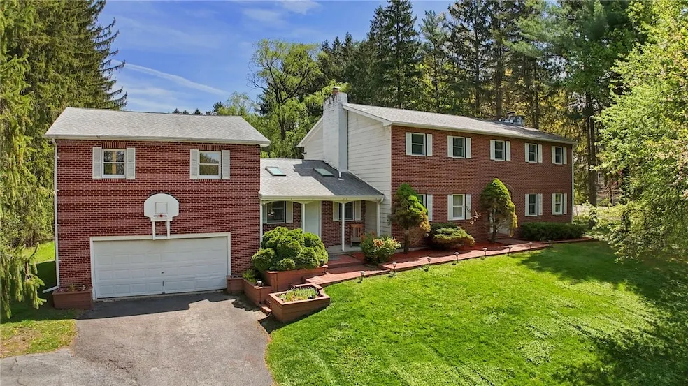 Nestled on a 2.2-acre lot in the heart of Cayuga Heights, this stately 5-bedroom, 4-bathroom Colonial offers 3,142 square feet of refined living space. The main floor is bright and spacious, featuring gleaming hardwood floors, abundant natural light, and a striking formal staircase that sets a classic tone upon entry. The thoughtful layout enhances both daily living and entertaining, with seamless flow between the formal living room complete with a wood-burning fireplace and an elegant dining room that exudes timeless charm. The updated kitchen boasts granite countertops, a center island, and counter seating, offering both functionality and style. Adjacent to the kitchen, a spacious family room features a vaulted ceiling, skylight, and a cozy stone fireplace, creating an inviting atmosphere for relaxation. French doors open to the tiered deck overlooking the backyard, blending indoor comfort with outdoor living. Upstairs, the home features two well-designed bedroom suites, each comprising a pair of bedrooms connected by a shared bathroom providing both privacy and convenience for family or guests. The spacious primary bedroom includes an ensuite bath and ample closet space. A generous unfinished bonus room above the garage offers endless possibilities, from a playroom or home gym to a guest suite. The partially finished basement adds flexible space for recreation, hobbies, or storage. Throughout, this exceptional property blends timeless Colonial architecture with modern amenities, all set in a tranquil and private setting. Experience the perfect harmony of elegance, space, and functionality in one of Cayuga Heights charming homes.