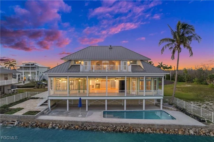 Step into a world where every sunrise paints the sky with pastel hues and every sunset sets the horizon ablaze with fiery brilliance. Welcome to your own sanctuary, where whimsy meets luxury in perfect harmony. Nestled along the picturesque Bay Front, this enchanting residence boasts five private en suites, ensuring unparalleled comfort and privacy for you and your guests. As you wander through the sun drenched halls, each window becomes a canvas showcasing panoramic views of the glistening bay front waters, inviting you to lose yourself in the tranquility of your surroundings. But the magic doesn't end there. Step outside into your own personal oasis, where a new heated salt water pool awaits, beckoning you to indulge in moments of pure relaxation. A New Standing Seam Metal Roof adds a touch of modern elegance to the timeless charm of your abode. For the avid boater, two boat lifts (new motors 2023) offer quick deep water access, where the allure of Sanibel Island, Ft Myers Beach and Cayo Costa beckon with their pristine shores and sun kissed sands. And for those seeking the thrill of the catch, the best fishing in Pine Island Sound is just minutes away, promising endless days of excitement on the open sea. With over 3700+ square of meticulously designed living space, every corner of this exquisite residence is a testament to the art of luxury living. So come, embark on a journey where every moment is infused with wonder and every day is a celebration of life's greatest treasures. Welcome to Paradise!
