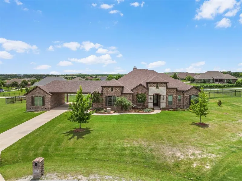 Horses allowed! Beautiful and functional 5-bedroom, 3.5-bath home situated on 2.2 acres in the highly sought after Aledo ISD, offering a perfect blend of luxury, comfort, and functionality. The added breezeway connects the main home to the new office suite, providing ample covered parking while enhancing the property's overall style & elegance. The kitchen highlights granite counters with a stone backsplash, tile floors, stainless steel appliances, tall cabinets with glass doors & a large pantry. This spacious home features hand-scraped hardwood floors throughout the main living areas & a functional open floor plan with tall ceilings, a stone fireplace, crown molding, ideal for everyday living & entertaining & room for everyone. The primary suite serves as a private retreat with tray ceilings with molding, dual vanities & two walk-in closets, while two secondary bedrooms are connected by a Jack-and-Jill bathroom. A fourth bedroom with an en-suite bath is perfect for guests & the fifth bedroom offers flexibility as an additional office or flex space. Utility room with cabinets & granite counters. The dedicated media room provides a true home theater experience with an attached powder bathroom on the second floor. Outdoor living shines with a covered back porch featuring a wood burning fireplace-perfect for relaxing evenings or casual lounging, along with a wrought iron fenced backyard ideal for added privacy and enjoyment. The property also includes a separate office space with its own private entrance, ideal for remote work, craft room or a home-based business. This space is equipped with two dedicated 30-amp electrical services, zoned HVAC for IT equipment, private security access & is pre-plumbed for a bathroom‹”offering potential for a secondary suite or multigenerational living. Situated on a roomy cul-de-sac, this property offers ample space for outdoor activities & the opportunity to fully enjoy the beauty of the land.