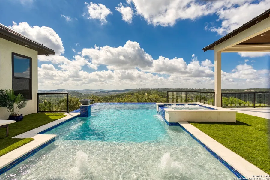 If you are looking for your Dream Home, this is the Smart Life Home for you. Spectacular Unobstructed Texas Hill Country Views for Miles, must see to appreciate. Modern amenities and upgrades are generously encompassed throughout this 1.6 acre hilltop Estate, easy access, level entrance. Travertine Foyer and entrance hallways leading into beautiful living area with gas fireplace and spacious open floor plan with cloud/pillow lighting and colors regulated. The Kitchen has large quartz island and countertops, Viking Refrigerator, Thermador Range and Dishwasher. Ceiling fans throughout home and special lighting indoors and out. Dining room and lovely wine storage area enough to hold 72 of your favorite bottles. Large walk-in Pantry with butler's pantry/coffee station. This home also has 2 utility areas with washer and dryer connections one in it's own closet, built in ironing boards, between the Master closets and one on the other side of home. Master bedroom has wonderful views of miles of hill country and access the swimming pool and voice activated window treatments. Two Large Walk-in Master Closets with built-in shelving, The Master bath has amazing Tub and Grohe Shower System, Separate Vanities , hidden ceiling fan. Swimming pool area has access to a bathroom, etc. Covered Patio contains built in Bull 5 burner BBQ grill. Large Office and a Bonus room for Exercise or additional Bedroom. This home is built for easy living and boasts 5 bedrooms, 4 full bathrooms, 2 half baths, 2 living areas, 1 downstairs and 1 upstairs with more bedrooms with bathrooms and wet bar upstairs, and lovely balcony in front to enjoy the amazing sunset views and beautiful sunrise mornings in the back! This outstanding home has many more amenities, a must view to appreciate. Six flags over Texas fireworks display is viewable over southern hilltop horizon! Very private area, conveniently located close to shopping, schools, restaurants, etc. Come take a private tour, you will not be disappointed! Smart home controlled by Smart Life app. Please follow driving directions in remarks for easiest and best route. Gated community, gate code. Very impressive home for your astute and discriminating buyer. ZONED HVAC SYSTEM. ADJOINS proposed 250 acre Nature Preserve area according to land owner. The uniqueness of this home will astound your Buyers!