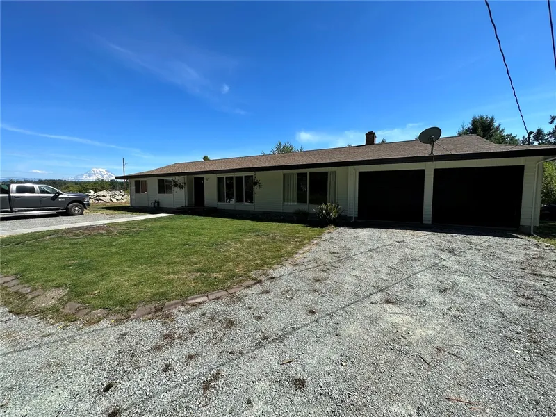 This beautifully 1488 sq. ft rambler, 3-bd plus, 2 bath, open floorplan, located on a acre+! Slate entry-way and wood-burning fireplace in spacious living room with modern railing feature; beautiful wood floors and bright kitchen with tile backsplash, beautiful cabinets, and stainless-steel appliances Beautiful views of Mt. Rainier! Large fire pit for entertaining bordered by hanging garden lights! Enjoy the new hot tub and 12x14 gazebo with built-in bar/counter with stunning mountain view! This property is a true gem and you’ll want to call it home immediately! 3 outbuildings, RV parking w/ RV carport; gated entry! New heat pump and A/C system and wired for generator.