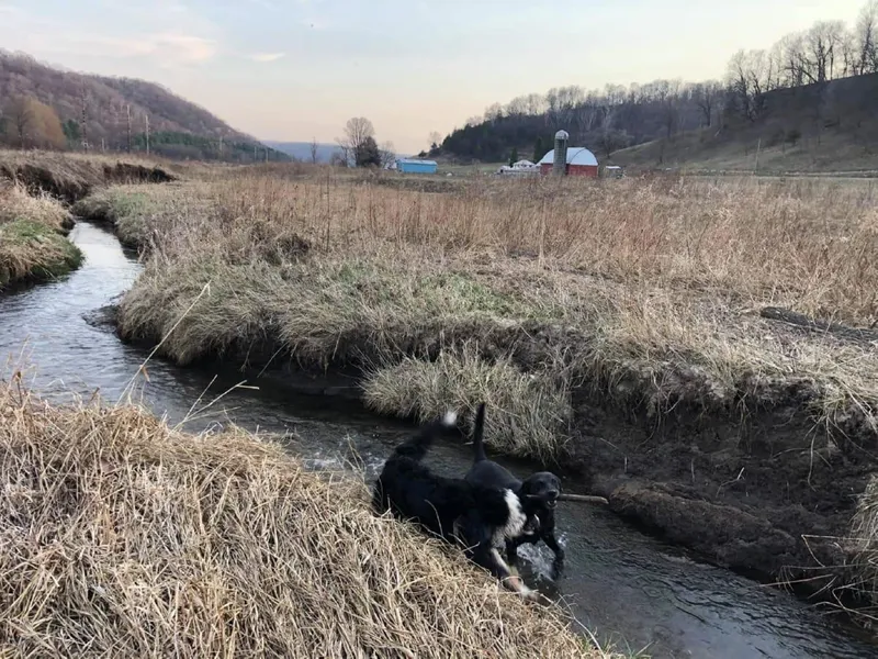 The barn functions today for a herd of dairy goats, and it could be used for a variety of livestock or storage. Today you can see about 130 goats and kids running in and out. Bucks and wethers spend summers grazing the north 40, while the nannies and kids enjoy the lush grass and clover of the 15 acres next to the barn, next to the trout stream known as the East Branch of the Mill Creek. Dont let the size fool you- there are 14-18 fish in the holes and hiding among the reeds. Walking the banks after each rain event can lead you to amazing finds.