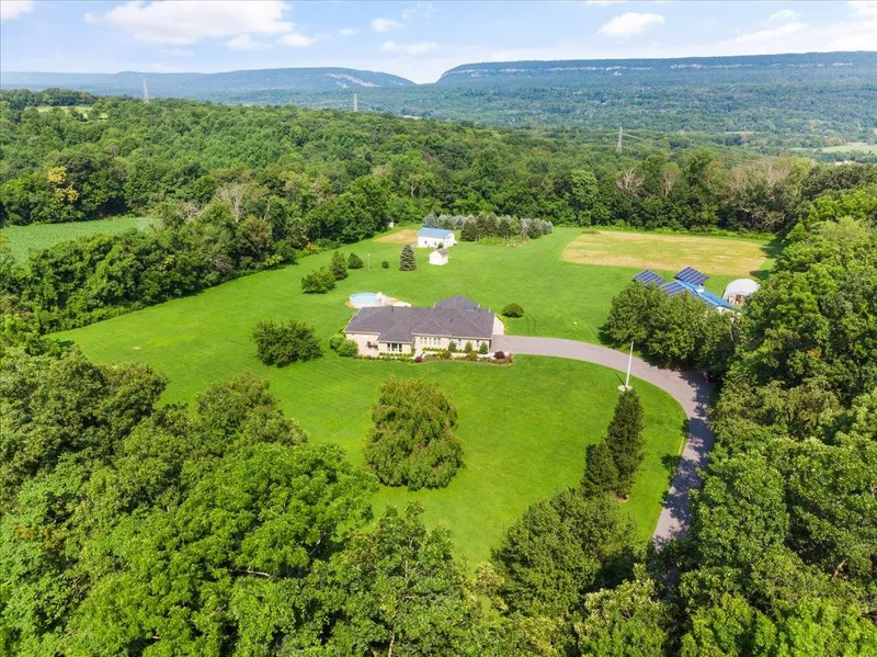 Custom Built Brick Ranch on 8+ acre Flag Lot. Morton Building w/Garage Door, Heat & Electric. Another Additional Garage for Farm Equipment, Shed, Greenhouse. Views of Mountains in a Private Setting. Magnificent Open Floor Plan, Cathedral Ceilings, Newer Kitchen & top of the line appliances, Breakfast Bar & Radiant Heat. Upgrades including A/C unit, Heating, Well Tank, Water Heater, Kitchen, Motorized Shades, Solar Panels, Roof, Second Kitchen, Bedroom floors, Driveway Alarm. Enter into Sunroom w/walls of windows, 41x28 Open area Living Room, Dining Room & Kitchen w/custom Center Island w/Breakfast Bar. Family Room features Cathedral Ceiling, large windows overlooking backyard w/Mtn View. 3 Car Heated Garage, A/C w/aux heat, ceiling fans, central vac & Laundry Room w/ Full Bath, Whole House generator.