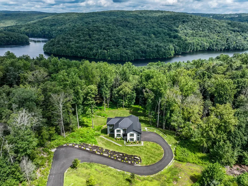 Welcome to 23 Logging Trail Lane in Brookfield, CT, where sophisticated contemporary living meets the tranquility of nature with 150 feet of frontage on the stunning Lake Lillinonah. This 2021 private wooded oasis is a masterpiece of design and luxury, featuring a two-story foyer illuminated by Hubbardton Forge lighting, a striking floating staircase, and wide plank floors that set the tone for the elegance within. The main level boasts an open floor plan with a gourmet kitchen adorned with leathered Quartzite countertops, designer backsplash, and ambient cabinet lighting. Entertain in style with the built-in multi-zone wine fridge and top-of-the-line Thermador appliances, including a side-by-side refrigerator with Open Door Assist technology for effortless access. The expansive great room is a true gem, featuring floor-to-ceiling windows that flood the space with natural light, a sleek Montigo gas fireplace, and a wood ceiling inlay that adds warmth and organic charm to the room. Formal dining and living rooms complete this level, providing the perfect spaces for hosting and entertaining.