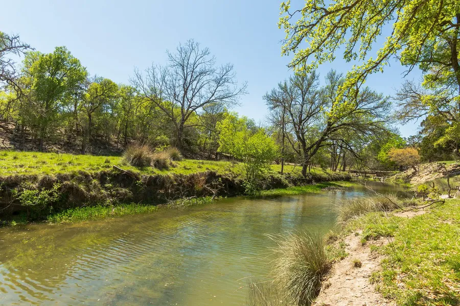 Unrestricted 23+ acres within 15 min of Fredericksburg in the heart of the Texas Wine Country. North Grape Creek runs along the southern border of the property. Large pecans, hardwoods and healthy oak trees are plentiful. There is a simple 1/1 and a detached workshop/garage that would need updating. An old stone smokehouse with windmill, root cellar and several outbuildings are also on the property. The possibilities with this tract are endless.