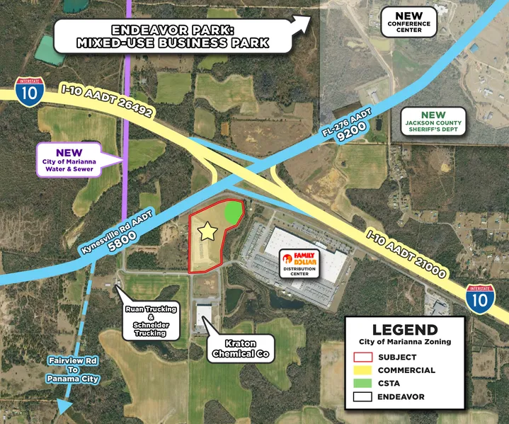 Possible Travel Center - 24+/- Acres on I-10 Exit 136. Some of subject Marianna City annexed and zoned commercial. Water and Sewer available. Possible uses Travel Centers, Warehouse Distribution, RV Resorts, Restaurants, Hospitality, Industrial, Distribution, and Residential. This intersection being incentivized for development by Jackson County, with their recent approval of the the adjacent 1,200 acre Mixed-use- Endeavor Park.