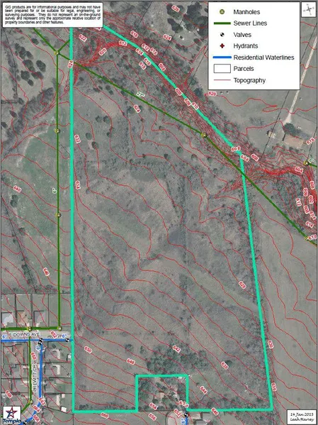 East Downs Avenue terminates into this 23.46 acre potential residential subdivision development tract in the City of Temple. City Utilities Available: 27" Water Line on Site, 6" Water Lines on Two Sides. Currently Zoned AG; Future Land Use Shows Single Family.