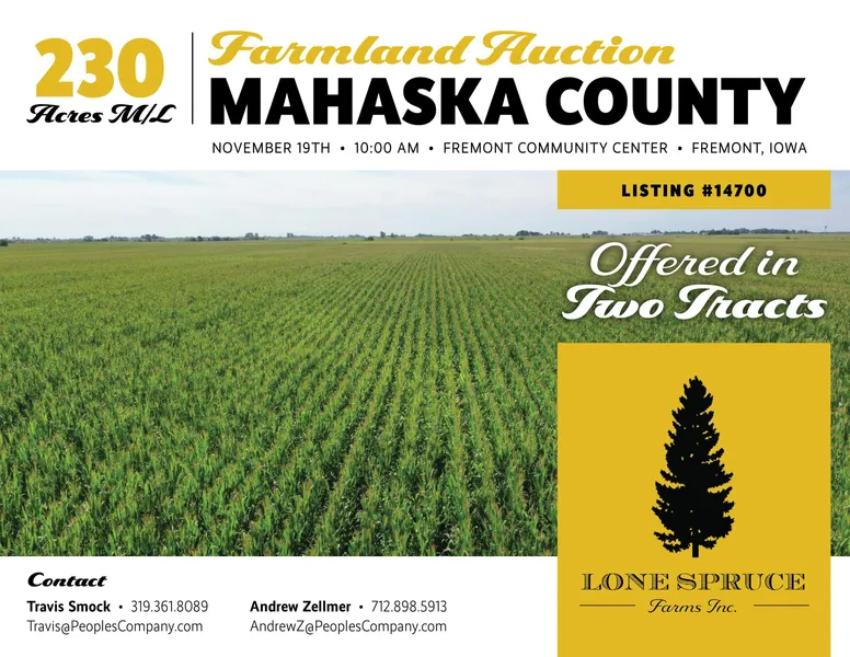 Exceptional quality Mahaska County, Iowa land auction! Offering 230 acres m/l of Fremont area farmland, available in two individual tracts. Auction will take place on Tuesday, November 19th at 10:00 AM at the Fremont Community Center in Fremont, Iowa. This is a golden opportunity to bid on farmland that is well above the county average CSR2 rating and located in an area where land rarely makes it to the open market.
