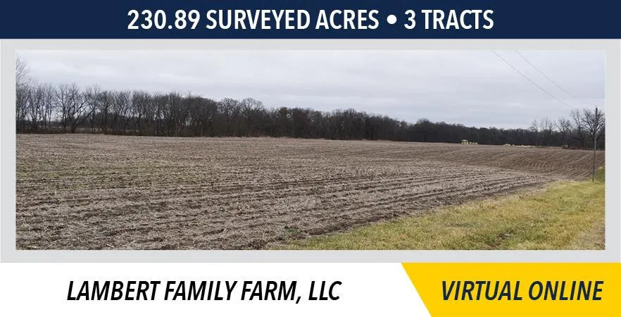 The Lambert farm contains a total of 230.89 surveyed acres, will be sold in 3 tracts, and represents productive tillable cropland with recreational areas and attractive home building sites. Parts of the Lambert farm have been in the Lambert family for over 175 years! This is a fantastic opportunity to bid on and own a diverse property loaded with potential!