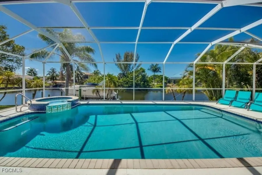 Welcome to Villa Sunshine, a beautifully maintained turnkey home located in one of Cape Coral's most desirable neighborhoods. This light-filled 3-bedroom, 2-bath residence offers immediate move-in convenience and an exceptional lifestyle on a quiet saltwater canal with a short and easy ride to open water. A private boat dock with a 10,000-lb lift provides direct access for boating enthusiasts, making this property ideal for enjoying the Gulf waters at any time. Enjoy Florida living at its finest with a stunning oversized pool and electric-heated spa, all set within a spacious screened lanai that provides generous lounging and entertainment areas. Inside, the home features a bright kitchen with white cabinetry, granite countertops, and an inviting dining space overlooking the water. Tile flooring flows through the living and dining areas for effortless maintenance, while all bedrooms offer warm laminate flooring. The primary suite includes a modern walk-in shower and double sinks. This home has been very well cared for and also offers an excellent rental history with strong income potential, making it an outstanding opportunity for both homeowners and investors. Its availability is limited due to seasonal bookings, underscoring the high demand in this sought-after location close to shopping, dining, and Cape Harbour. Turnkey and ready for its new owners, this property combines comfort, style, and a premier waterfront setting-ideal for enjoying the Southwest Florida lifestyle year-round.