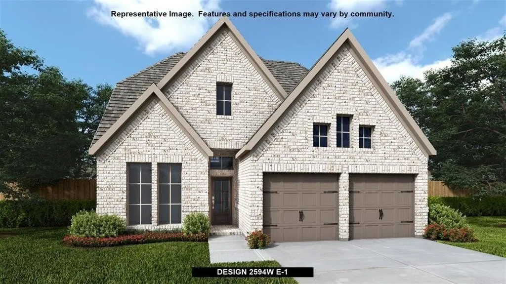 Home office with French doors set at two-story entry. Dining area opens to kitchen and adjacent two-story family room. Kitchen features walk-in pantry, a 5-burner gas cooktop and generous island with built-in seating space. Family room features a wood mantel fireplace and wall of windows. First-floor primary suite includes primary bath with dual vanity, freestanding tub, separate glass-enclosed shower and two walk-in closets. An additional bedroom is downstairs. A game room and two secondary bedrooms are upstairs. Covered backyard patio. Mud room off two-car garage.