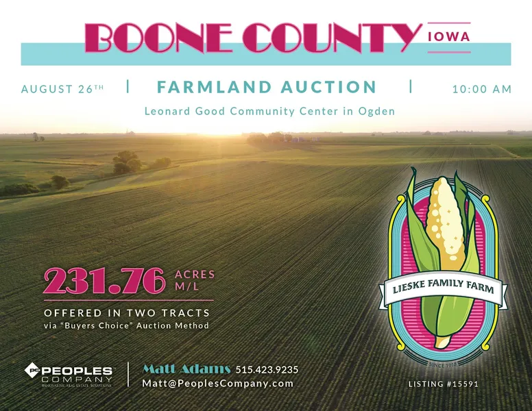 Boone County, Iowa Land Auction Mark your calendar for Thursday, August 26th, 2021 at 10:00 AM! We are pleased to be representing the Lieske Family Farm in the sale of 231.76 total acres m/l located just south of Ogden, Iowa. The beginning of the Lieske Family Farm dates back to 1918 earning the prestigious Century Farm status, meaning the farm has had the same family ownership for over 100 years and creating a rare opportunity to purchase farmland not available to the public since then.