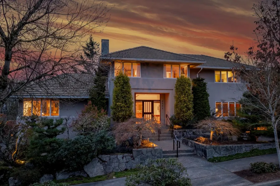 Nestled in Portland's West Hills, this custom-built contemporary home uses thoughtful design to maximize natural light and stunning views. Tall ceilings and rows of picture windows flood the interior with sunlight throughout the day, highlighting clean lines, warm wood trim, and elegant built-in details. Distinctive architectural elements, like a curved staircase and illuminated floating tray ceilings, emphasize the home's unique craftsmanship. A functional layout seamlessly connects multiple gathering spaces - a living room with a floor-to-ceiling stone fireplace and a dining room with handmade built-ins both open onto a spacious deck, creating an effortless indoor-outdoor flow perfect for entertaining. The kitchen pairs extensive counter space and high-end appliances, including dual wall ovens and a Sub Zero refrigerator/freezer, with a sun-drenched breakfast nook that opens to a side yard. Completing the main level are a full bath and a versatile den with outdoor access that could serve as a 4th bedroom. Upstairs, the primary suite captures both northern and southern light through two walls of windows, and features dual closets and a luxurious bath with soaking tub and shower. A generous laundry/mud room on the lower level offers abundant storage. Meticulously maintained by the original owner, the property is in pristine condition with a low-maintenance yard and backs directly to protected green space. Bordered by 5,200-acre Forest Park and its 80 miles of trails, the Northwest Heights neighborhood offers the ideal blend of seclusion and convenience, just 20 minutes from downtown Portland.