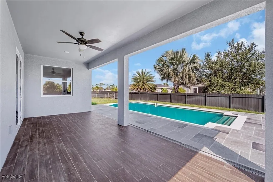 New Construction $5,000 Seller Bonus Toward buyer for closing cost. Ready to move in. with a Special Location. Unique in the neighborhood with a long sidewalk which starts at El Dorado Blvd and ends at Nelson Rd N. 4 mills designed for biking and walking, making it ideal for an active lifestyle. 3 bedrooms + Large den and 2 bathrooms, designed for modern living with style and comfort. The high ceilings allow for plenty of natural light, creating a bright and inviting atmosphere. The modern kitchen is equipped with soft-close cabinets and stainless steel appliances, offering both elegance and functionality. The home boasts beautiful ceramic tile flooring throughout, adding a touch of sophistication and easy maintenance. outside to your fenced backyard, where you'll find a Private pool with an outdoor shower, perfect for enjoying Florida's sunny days. Don't miss this incredible opportunity-schedule your showing today