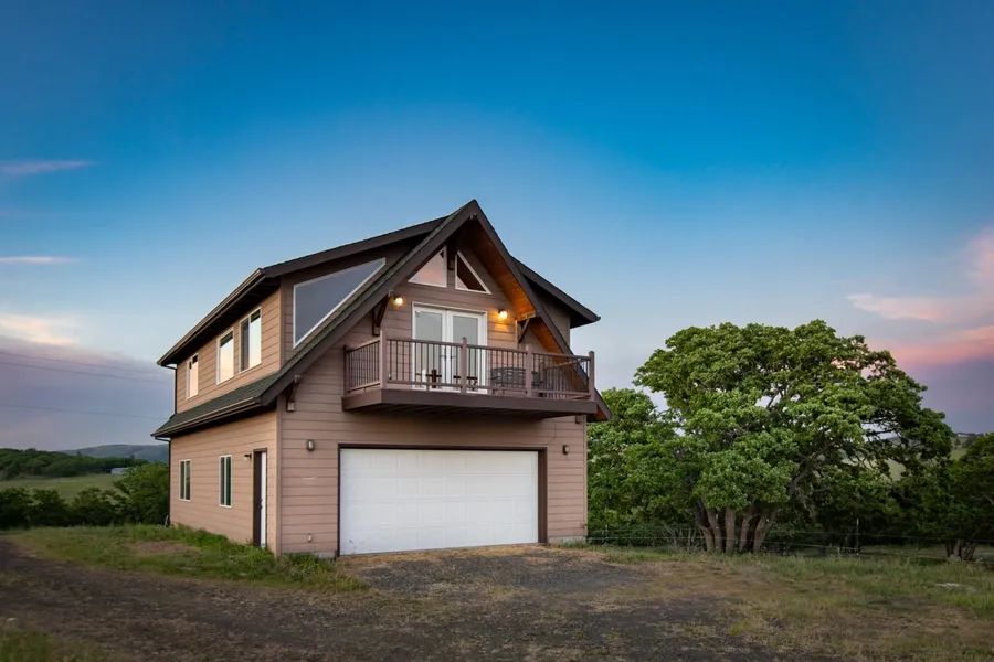 This serene oasis boasts sweeping, majestic views of the Columbia River Gorge and Mount Hood, situated on 20 beautiful acres that provide seclusion and privacy at the end of the road. Multi-generational living or income producing, this property offers two homes. The A-frame residence features a double-car garage and encompasses a 960 square foot upper loft, complete with two fantastic decks ideal for enjoying the breathtaking scenery. The interior showcases an airy and open great room with exposed timber, a kitchen equipped with an eat-in wrap-around bar, granite countertops, stainless steel appliances, a Murphy bed, and a bathroom. The lower level spans 432 square feet and includes a bedroom or art studio, a spacious utility room, a new water heater, and a covered patio. The updated 1994 manufactured home offers 1,680 square feet featuring three bedrooms or office spaces, two baths, family and living rooms, and a large deck. Recent upgrades include new exterior paint, flooring, countertops, appliances, sink, hardware, and lighting fixtures. Outdoor amenities include two fenced paddocks for horses, one with a run-in shed, trails throughout the property, and a wooden yoga platform or seating area to soak in the views of Mount Adams. As an income-producing property, both homes are currently leased. This beautiful estate presents numerous opportunities.