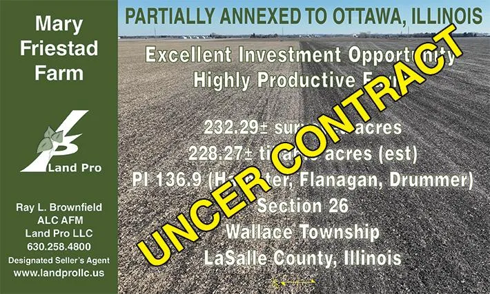 The Mary Friestad Farm is an excellent investment opportunity, has good drainage with highly productive Class A soils (PI 136.9), is partially (southeast 40 acres) annexed to Ottawa, Illinois, and near the I-80/IL 23 interchange. The Mary Friestad Farm is partially annexed to Ottawa and is 12.9 miles east of LaSalle, 74.9 miles northeast of Bloomington, 76.5 miles northeast of Peoria, 83.1 miles southwest of Chicago, 83.5 miles southeast of Rockford, 95.7 miles southeast of Moline, 143.0 miles northeast of Springfield. GPS 41.382990, -88.853437