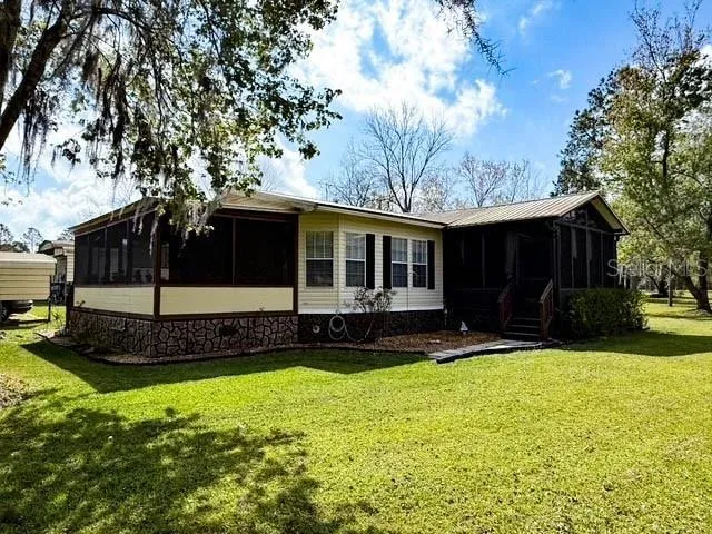 Attractive country living in this 3-bedroom, 2-bath home on 2.5 acres in Lawtey, surrounded by mature trees. The open-concept space features an updated kitchen flowing into the living room. Enjoy the enclosed 16x12 lanai or entertain on the spacious 24x12 side porch. The primary bath has both a walk-in tub and walk in shower. Additional features include a metal roof in 2018, full RV hookup, and ample storage with two sheds, 8x10 and 10x20 and 6x6 pump house. A 18x20 carport and a 45x40 three bay barn provides extensive covered parking. Easy commute to Jacksonville or Gainesville.