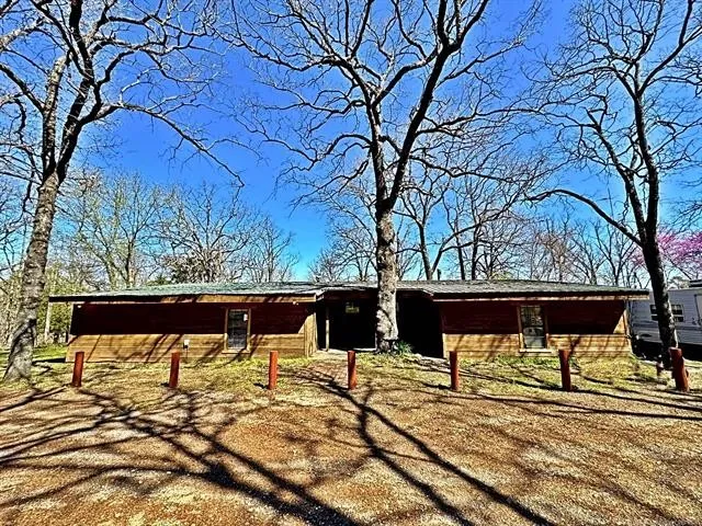 Cedar wrapped spacious home on 5 acres m/l just outside of town! This 3 bedroom, 1.5 bath 1,724 sq ft (per CH) home is situated down a long, winding drive through park like mostly flat land. The east half of the property slopes appx 300ft down into the woods to a holler with a natural spring. Home has been added onto for a spacious master with private access through french doors to the patio shaded by an old oak tree. Large kitchen with tons of counter space and oversized living and primary bathroom. Bathroom features jacuzzi tub with handmade surround and steps. Property features oak, pine, hickory, cottonwood and dogwood trees. Detached 2 car garage with a double lean to attached. Metal roof. 2.5 miles to the River and 5 Miles to town for convenient rural living.