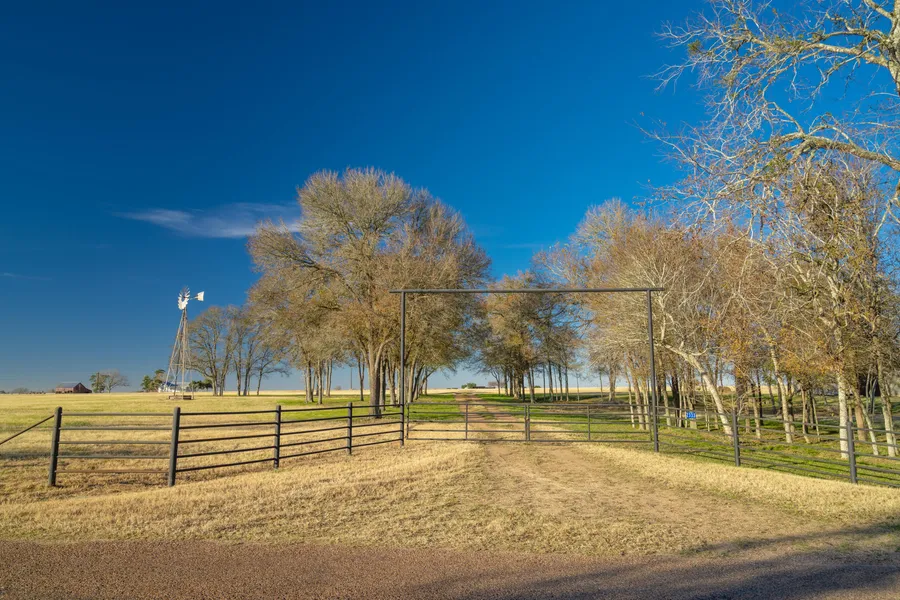 The main entrance welcomes you onto a driveway lined by mature native oak trees. Across the pasture upon the horizon is a 1903 German Farmhouse adorned with an antique red barn. Nestled within a cluster of pecan and oak trees sits a 6,000 sq ft metal barn. The drive up to the house meanders past a windmill and old hand-dug water well. Open, cleared, improved Bermuda pastures make this gorgeous tract the perfect place to turn out livestock or build a dream home. Light restrictions ensure that neighbors uphold the same standard of country living. The soil allows for diverse farming, with the potential for residential or recreational uses. The ranch has paved road frontage and a perimeter fenced with five-wire fencing. Don't miss the opportunity to own this stunning property!