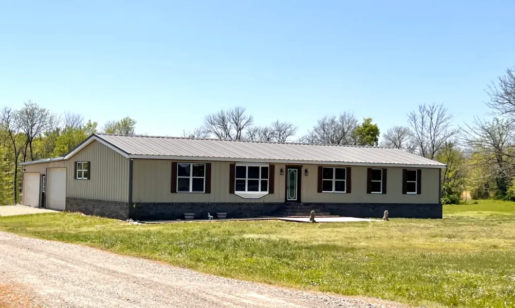 This beautifully updated 1997 oakwood double wide manufactured home , securely bolted to concrete runners has been updated with 1/2' osb green zip board and 26 gauge commercial metal on the exterior and roof with wood shutters added. A standout feature is the attached 30x40 two-car garage/shop, providing ample space for vehicles, storage, or projects. Additionally, a 12x24 hobby room is conveniently attached to the garage, perfect for crafting, a workshop, or extra storage. Inside the garage/shop is a walk-in shelter.