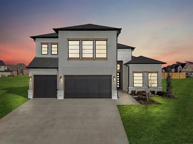 Contemporary design with super functional layout and upgraded amenities make this new build one you will definitely want to see! Two bedrooms & two baths down plus office; two bedrooms & one double-sided bath up w/ game room & wet bar w/ drink fridge. Living room has granite fireplace surrounded by cabinetry and lighted shelving, blonde oak hardwoods and wall of windows looking on to the large covered back patio. Dining area between living & kitchen w/ chandelier. Kitchen has locally crafted custom cabinetry, large island w/ space for seating, professional grade appliances, coffee bar, wall oven & microwave and gas cooktop plus walk-in pantry. Luxurious master suite off kitchen w/ soaker tub, divine shower, double vanity w/ cabinetry in the middle, xl closet (the size of a bedroom!) packed w/ shelves, clothing racks, big mirror, bench, and pull-down racks; private door to covered patio. Large laundry room packed w/ cabinetry, countertops and sink. Tankless hot water, sprinkler system, walk-in attic storage, grill stump, floor outlet. Drop zone off garage. Sprinkler system. Neighborhood plans to have ponds, walking trails and a large playground. This home will absolutely delight the discerning buyer!