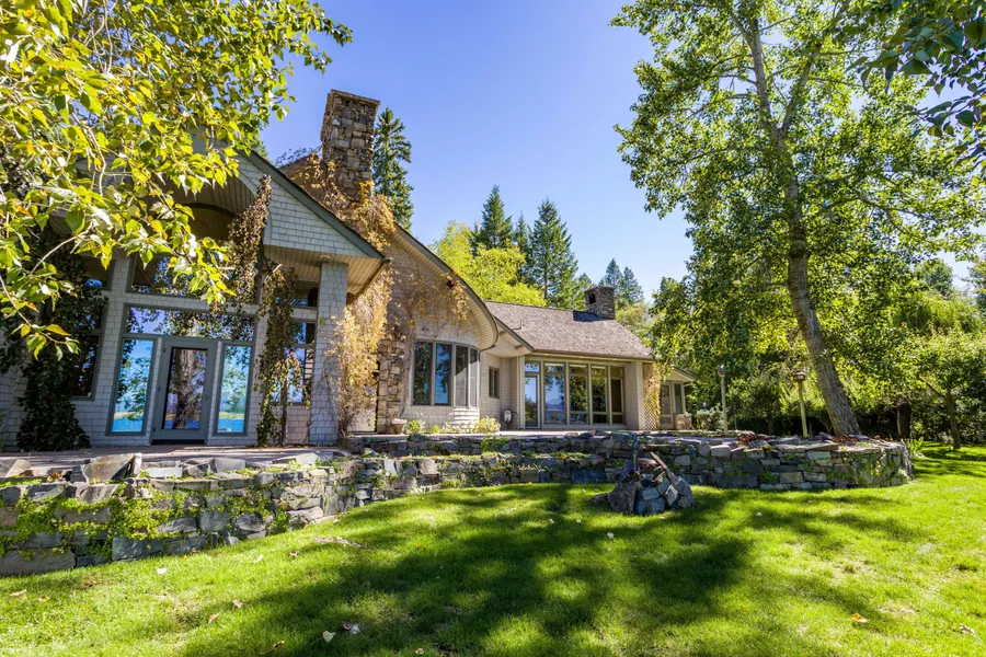 With 176 feet of Flathead River waterfront, this 5,430 sq ft 3-bedroom, 3.5-bathroom estate is located on the north side of Flathead Lake. With a paved circle drive behind a gated entrance, this luxury home offers both elegant exterior and interior details. Upon entering the grand entry with the wrap around staircase, the main level is perfect for family living and entertaining. This level includes a masculine den, a step down living room with a stacked rock fireplace and massive windows to take in the river view, an exceptional gourmet kitchen with large L shaped bar, a large gathering room with windows on both sides, and a screened in porch. Additionally, the main level offers a large billiard room with wet bar, an outdoor poker room, a full bedroom en-suite, an elevator for easy access to the upper level, and a spacious laundry room that opens into the oversized attached three car garage. At the top of the wrap around staircase, there is a library area, a balcony looking over the lower level family room, a guest bedroom, a spacious master suite with a fireplace and outdoor deck, a large master shower, 2 spacious walk in closets, and the upper level elevator landing. Above the 3-car garage is a western style guest quarters complete with a full kitchen, living area, master bedroom and bath. The home is surrounded with stacked rock planting beds, mature shade trees, several flagstone patio's, and a boat dock. Live in luxury on the Flathead River, one block from the famous Eagle Bend Golf Course, minutes from Bigfork Montana and at the end of a quiet paved lane.