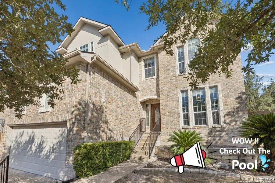 Welcome to 23503 Enchanted View. Located in the prestigious gated Heights at Stone Oak community, this stunning 4-bedroom, 3-bath, 3,187 sq ft two-story home sits on a spacious 0.29 acre corner lot. Enjoy resort-style living with a sparkling in-ground pool, large backyard, and a covered patio with gazebo, Perfect for entertaining. Inside, the home features a thoughtfully designed floorplan with travertine tile in the main areas, and wood flooring in key bedrooms and the office. The kitchen is a chef's dream with a gas cooktop, designer chef's vent hood, walk-in pantry, breakfast bar, and plenty of counter and cabinet space. Adjacent to the kitchen is a breakfast nook that flows seamlessly into the living room where a cozy fireplace and large windows create a bright and welcoming atmosphere. The private primary suite, located upstairs, includes dual vanities, a garden tub, walk-in tiled shower, and large walk-in closet. A secondary bedroom is located downstairs, with two more upstairs, plus a versatile finished bonus room above the garage making this space ideal as a game room or media room. Additional highlights include a dedicated home office with French doors, formal dining room, 2-car garage, and water softener. Don't miss your opportunity to own this exceptional home in one of San Antonio's most desirable neighborhoods.