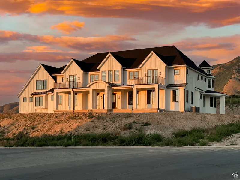 Stunning Custom Estate in prestigious Triple Crown. The mountain and valley views are breathtaking, as this luxury home was built to feature natural light* Great for entertaining with an open floor plan and high-end finishes throughout* GOURMET KITCHEN features top of the line appliances, a spacious island, and walk-in butler pantry* Main floor living includes a large craft room, music room, and an expansive great room with soaring ceilings highlighting the views and natural light* The upstairs features a large master suite and additional bedrooms, library space and additional family room areas* The third story features a unique play loft accessed by a spiral staircase* The 7 car garage includes a 4-car basement level space accessed behind the home, which is also an ideal shop, gym, or additional storage* Basement is plumbed for a second kitchen and theater room* Zoned as HORSE PROPERTY with completed landscaping plans and drawings for a detached accessory home and garage* A rare opportunity to own a newly built Parade of Homes quality custom home with unmatched craftsmanship, flexible spaces, and panoramic views in one of Mapleton's most desirable areas.