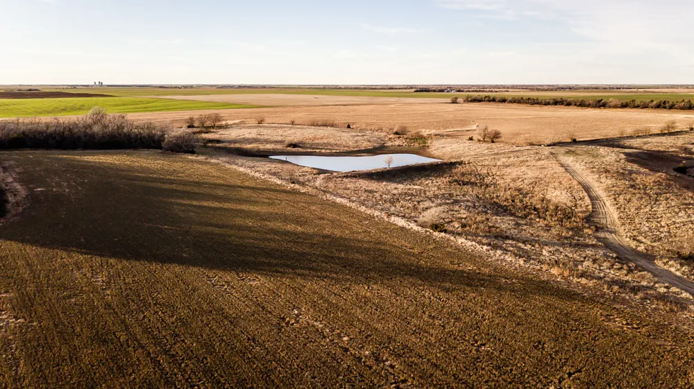 The interior of the farm is a nice native grass pasture with a 1+ acre pond, keeping cattle and wildlife with water year-round. This pasture has a nice canyon feel to it as a seasonal creek snakes through the middle of it with several sparse trees throughout. Currently, there is a nice alleyway fence right into corrals making it easy to work and load cattle on this farm. This farm can easily be set up to move cattle from pasture to milo stalks or wheat pasture in the fall/winter and sets up very well for a rotational grazing program.