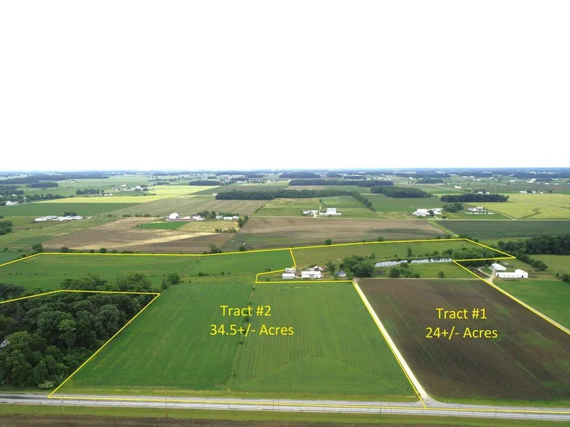 Tract #1 consists of a 2,300 sq ft Home, Pond, 40x64 Bank Barn, Silo, Several Outbuildings, all situated on 24+/- acres.