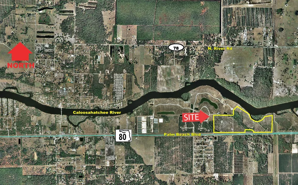 Grand Caloosa Estates is a riverfront property that is approximately 109.81 acres and is located at 23631 SR 80 (Palm Beach Blvd) along the Caloosahatchee River in Alva, Florida. The site is approximately 15 miles east of I-75 on the north side of SR 80. Grand Caloosa Estates has roughly 3,000 linear feet of river front and approximately 4,000 feet of SR80 frontage. The property also has ingress and egress from both east and west bound lanes of SR 80.