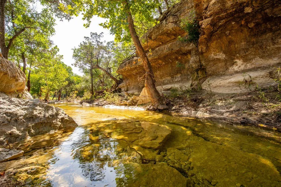 Prime unrestricted acreage with over 300 feet of frontage on Nameless Road, located directly across from the prestigious Travisso community in Leander -- one of the fastest-growing cities in the Greater Austin Metro area. This property offers a rare blend of private, ranch-style living with easy access to city amenities and incredible future potential. The home and guest house were thoughtfully remodeled and upgraded in 2021, while selective removal of brush and cedar brought new life to an already beautiful landscape. The owners were meticulous in selecting native plants, reducing water needs while enhancing the picturesque setting. From the home down to the bluff-lined creek and around the approximately 3, 000 square foot irrigated garden surrounded by pecan trees, this property truly embodies the Hill Country lifestyle. Cedar Park MS and HS.