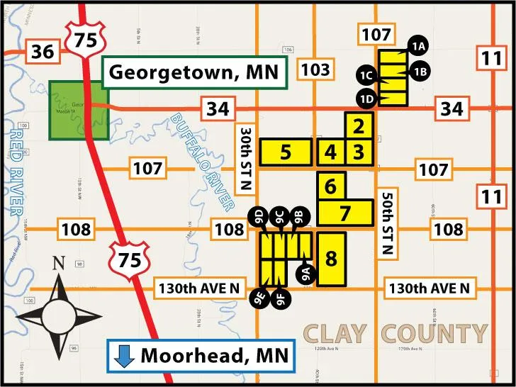 Driving Directions: From Georgetown, MN: Drive east on HWY # 34 for 5 miles to 50th St. N. This will place you at the southwest corner of Parcel 1 & the northeast corner of Parcel 2. From this point, Parcels 3-9 are all contiguously located to the southwest. Refer to driving map for details & look for the Pifers signs.