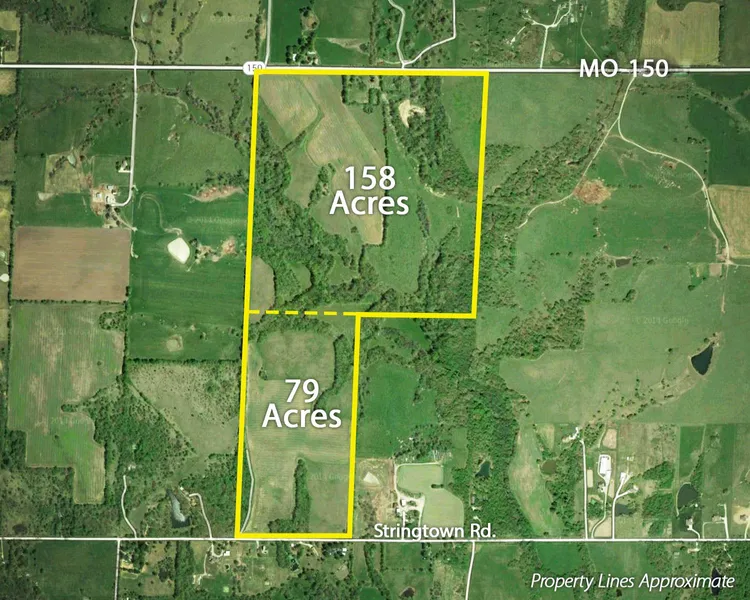 This 157 acre tract has been primarily used for grazing cattle and hunting. is currently for pasture and roughly 40 acres of crops, rolling hills, valleys, a creek, hardwood timber, is fenced and cross fenced, has asphalt highway road frontage and is perfect for livestock, crops, hunting, home site or investment. Lee Summit school district.