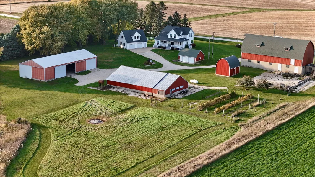 This picturesque 5-acre hobby farm is surrounded by a mature pine and maple wind break with south facing panoramic views.