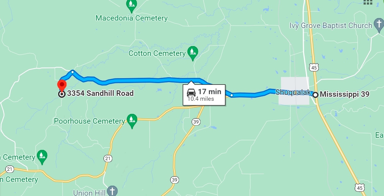 Research Parcel InformationDirections from the intersection of Hwy 39 and Hwy 45 in Shuqualak: Travel west on Hwy 39 for 3.2 miles. Turn right onto Shuqualak Road and travel 6.2 miles. Turn left onto Sand Hill Road and travel approximately 1 mile. The gate and entrance to the property will be on the left.