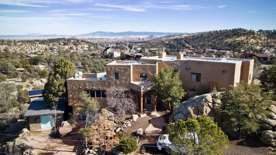 Welcome to the ultimate in Prescott charm! Home is nestled perfectly amongst the boulders with each window positioned perfectly to take in panoramic views of the S.F. Peaks, Mingus Mountain Range, Willow Lake, the Dells & city lights! Custom touches throughout this multi-level Santa Fe style home include hand placed flagstone floors, built-in art niches, china & other display cabinets, hand-crafted custom cabinetry, peeled poles & walls of windows! Master suite offers private patio, separate jetted tub & shower, dual vanity & large walk-in closet! Mini-master also includes private deck, with 3rd bedroom on lower level is a great place for office or home gym which has an exit to detached workshop. Workshop is plumbed & could easily be converted to guest quarters. Property is full of walking paths & RV driveway.