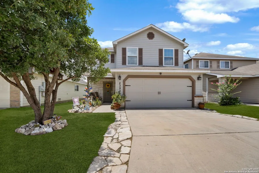 Welcome to this stunning 3-bedroom, 2.5-bathroom home nestled in the highly desirable Bulverde Village community. With a spacious upstairs loft and NO carpet throughout, this home offers both comfort and style. The entire downstairs showcases elegant crown molding and hard surface flooring, creating a clean and polished look. The upgraded kitchen features bright white cabinetry, sleek granite countertops, and modern finishes-perfect for any home chef. The generous upstairs master suite boasts a large walk-in closet, while the backyard is ideal for entertaining with a shaded pergola, 220V hookups, and a separate storage shed. Backing to a peaceful greenbelt, you'll enjoy added privacy and nature views. Freshly painted inside and out, this home is move-in ready. Additional recent updates include a rebuilt HVAC system (2023), Hot Water Heater (2023), and tint on windows. Enjoy a short commute to Highway 281, top-rated NEISD schools, shopping, and restaurants. Fantastic amenities including a park, volleyball court, walking trails, and more! Don't miss this incredible opportunity-schedule your showing today!