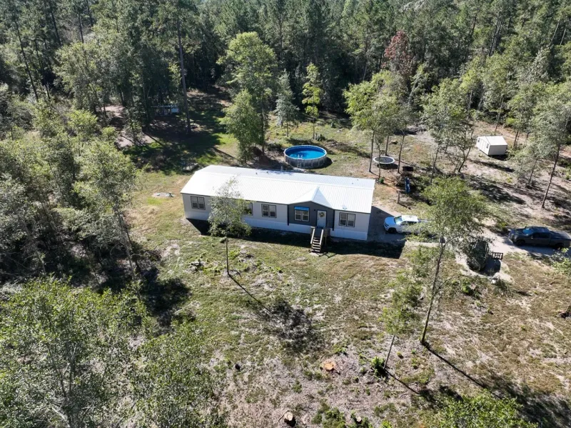 Spacious 4-bed, 2-bath manufactured home on 4.9 wooded acres. Open-concept layout features a kitchen with island seating and walk-in pantry, seamlessly connected to the dining area and main living space. A large deck off the dining area extends outdoor living. Primary suite offers a walk-in closet, dual sinks, soaking tub, and separate shower. Three secondary bedrooms (12x14 each) surround the family room with fireplace and easy access to the kitchen. Utility room includes back door access to the deck. Outdoor highlights include an above-ground pool, chicken coop, and partially cleared trails through East Texas trees. Property has underground electric to the house, community water, and aerobic system. An additional driveway with water tap and separate electric meter adds versatility. No HOA. Owner Financing Available, contact listing agent for details.