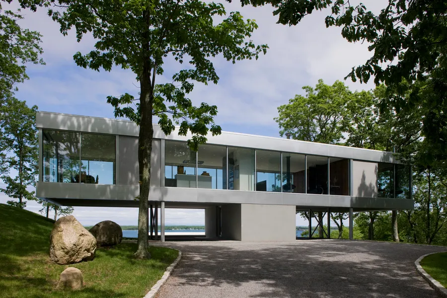Down a long secluded driveway sits a stunning contemporary modernist home, Clearhouse. A haven on 6 acres overlooking the Peconic Bay, designed by SP Design, offering one of the single greatest vistas on the east end of Long Island. The house offers 360-degree views - 180 degrees being Peconic Bay, The North Fork, The Long Island Sound, and Connecticut - the south view is indigenous manicured forest with undulating elevations. On the first floor you will enjoy a full-width terrace, private office. The upper floor is equipped with a gourmet kitchen with signature appliances, dining area, sitting area and large master bedroom with views from every angle. The master bedroom is comprised of 3 sides of glass - the width of the room opens completely to the elements like a modern treehouse. The lower level, with equally incredible 180 degree views has a perfectly positioned family room, 2 guest bedrooms and 2 baths overlooking bay views. The home offers a dock with a 6,800 lb. boat lift, including additional room for a 55' boat and a 30' boat. Unparalleled sunset views every evening. Also available the month of November for $30K; month of December for $30K.